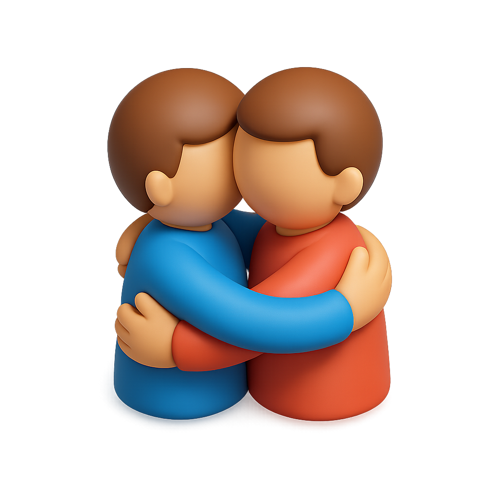 A stylized 3D icon depicting two people embracing, designed in a colorful, isometric style with a transparent background. The figures are represented in blue and red.