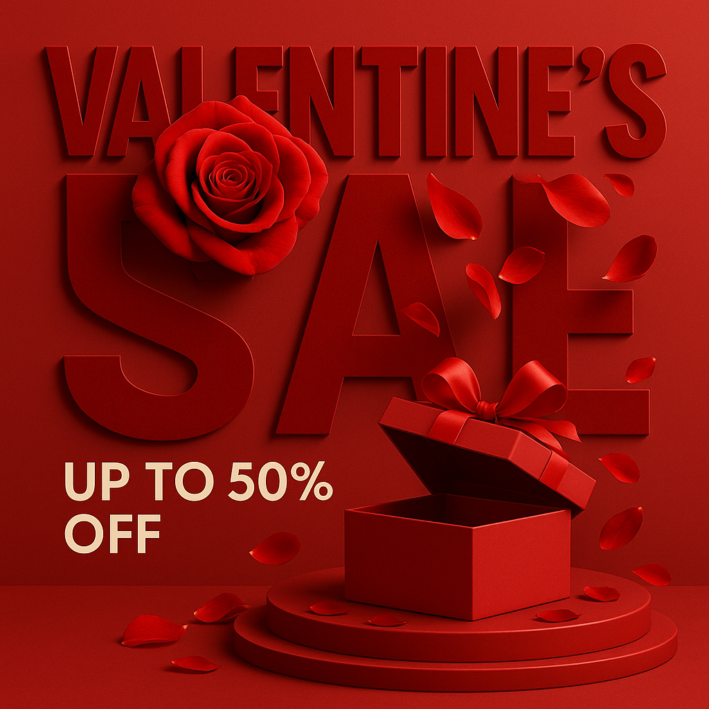 /Collection: /by davooda/Type: PNG/Vibrant 3D promotional graphic for a Valentine's Day sale featuring a red gift box, rose, and elegant typography. Ideal for e-commerce marketing and social media.