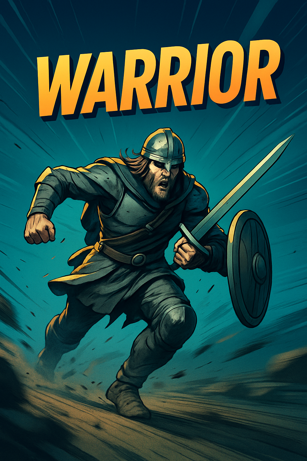 An intense illustration of a warrior in motion, brandishing a sword and shield, set against a gradient background. The bold title 'WARRIOR' captures the dynamic essence of the scene.