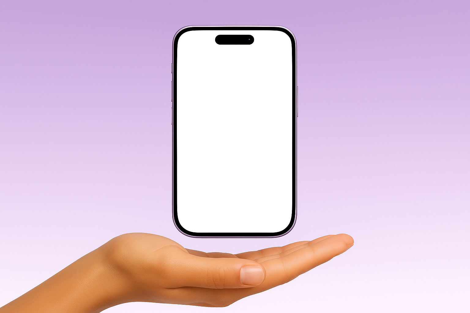A sleek purple smartphone hovers above an open hand, featuring a blank white screen. The phone has rounded edges, creating a modern aesthetic against a soft purple gradient background.