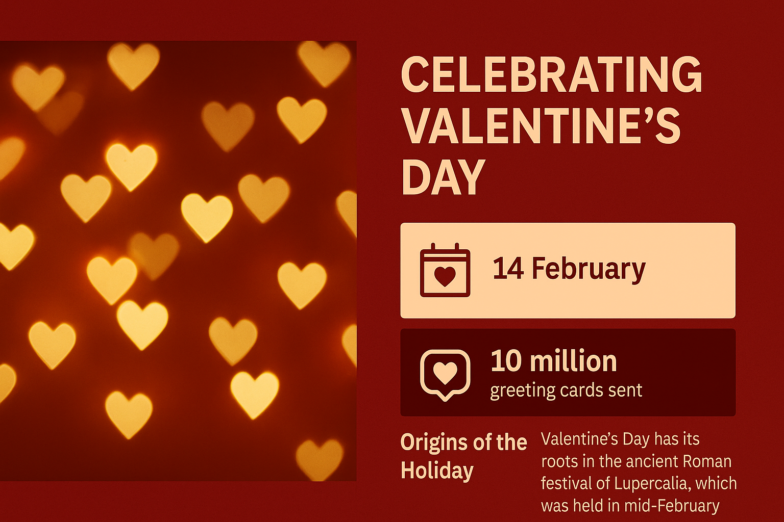 Informative infographic celebrating Valentine's Day with a warm color palette and heart motifs, ideal for educational or promotional use around the holiday.