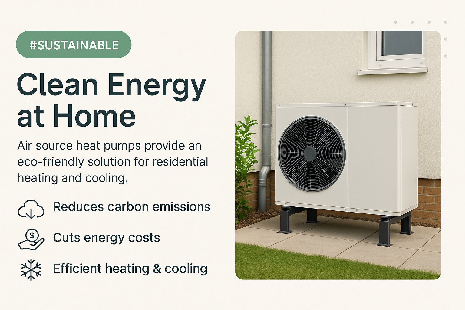 /Collection: /by davooda/Type: PNG/Informative graphic showcasing an air source heat pump, emphasizing its eco-friendly benefits for residential heating and cooling. Designed for sustainability-focused audiences.