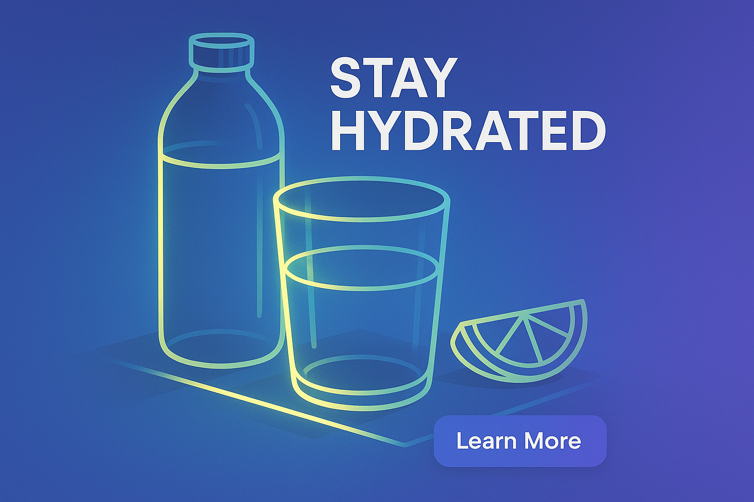 A vibrant design featuring a water bottle, glass, and lime slice in neon outlines. The background is a solid blue with glowing accents, promoting hydration.