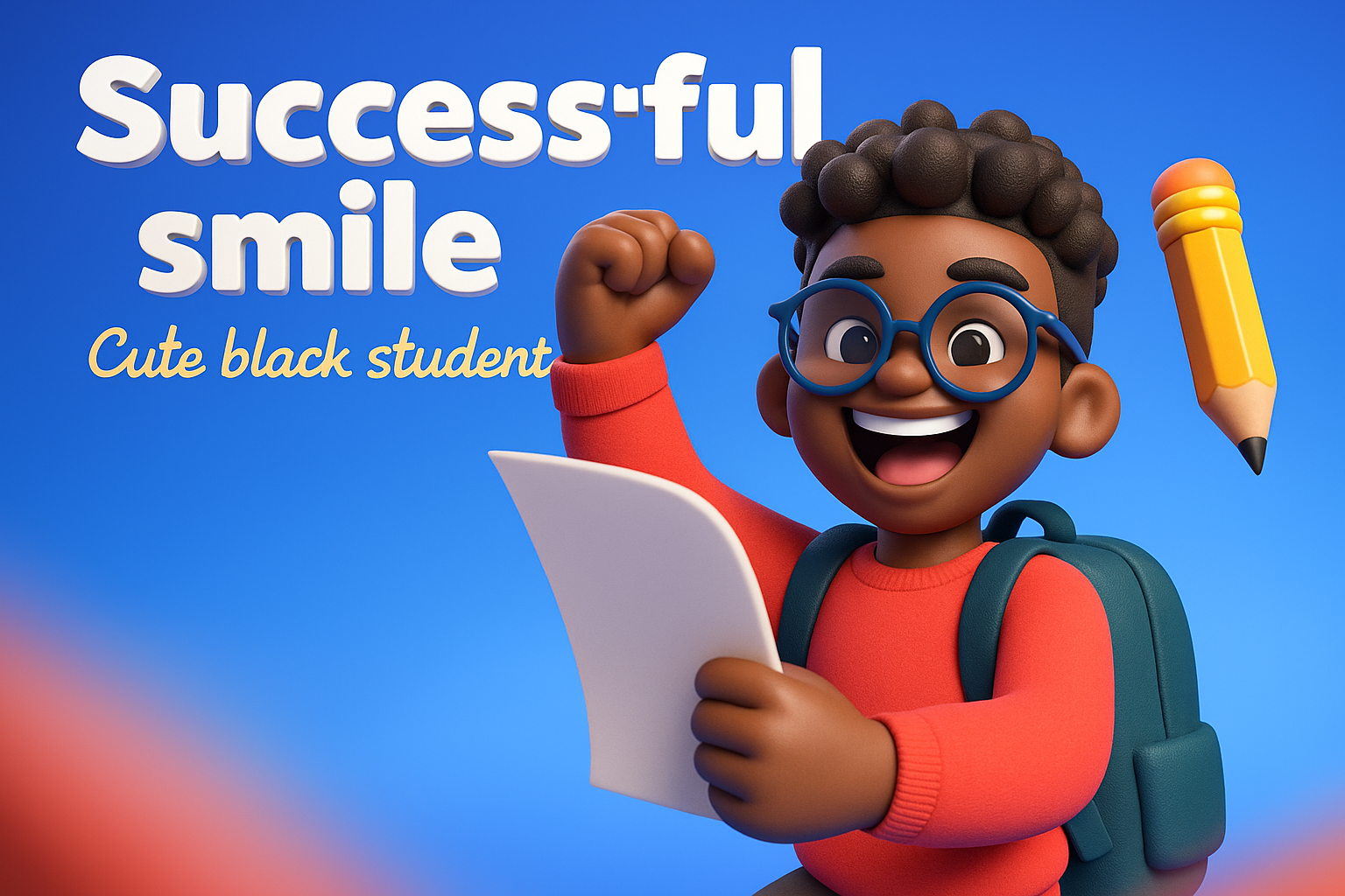 A vibrant 3D illustration of a cute black student smiling and celebrating success, holding a paper with a pencil nearby. The background features a smooth gradient.
