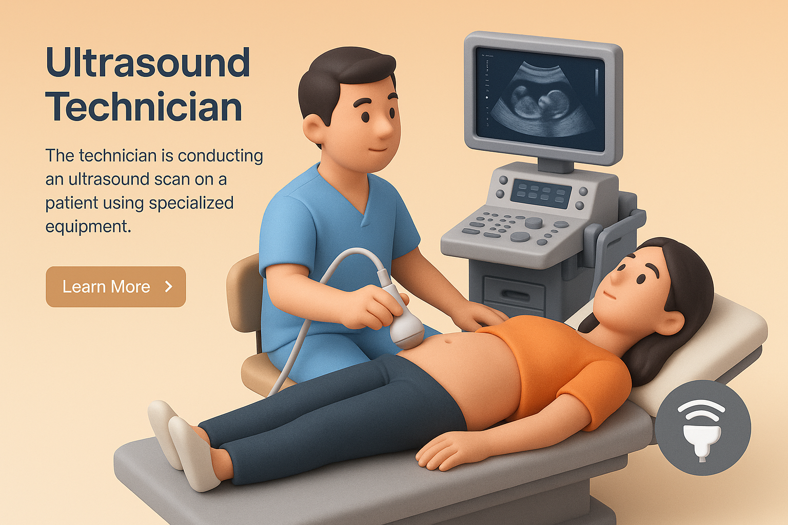 A detailed 3D illustration capturing an ultrasound technician performing a scan on a patient. The scene includes a medical ultrasound machine and emphasizes realism with a smooth gradient background.