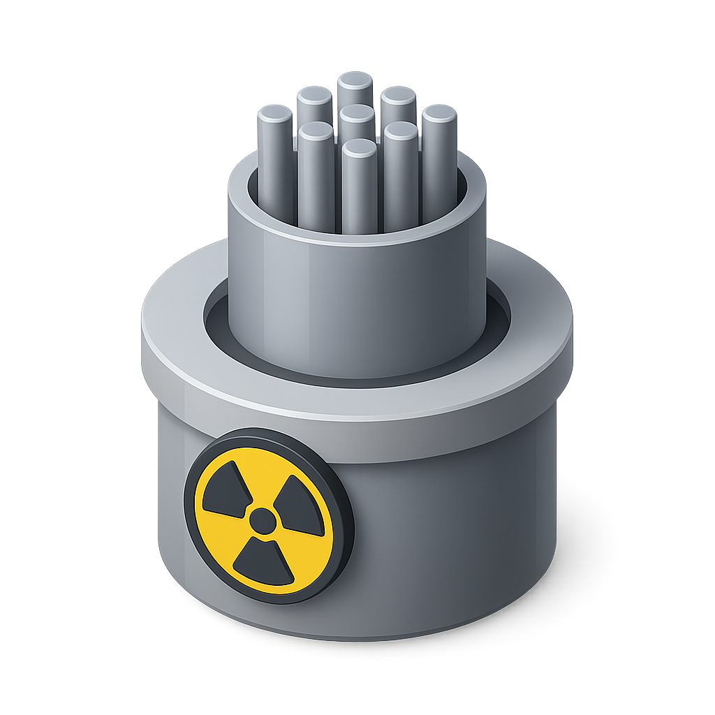 A stylized 3D icon of a nuclear reactor core, featuring a cylindrical base with protruding fuel rods. The design incorporates volumetric shading and a transparent background.