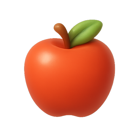 A vibrant 3D render of a stylized red apple featuring a smooth surface and a green leaf, perfect for use in educational materials, health-related graphics, or food-themed designs.
