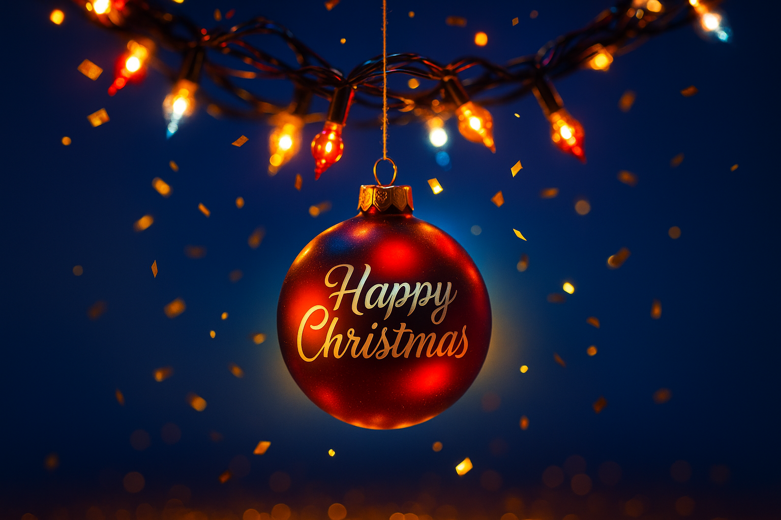 /Collection: /by davooda/Type: PNG/A beautifully illuminated Christmas ornament hangs against a vibrant background, surrounded by sparkling confetti and glowing lights, creating a festive winter atmosphere.