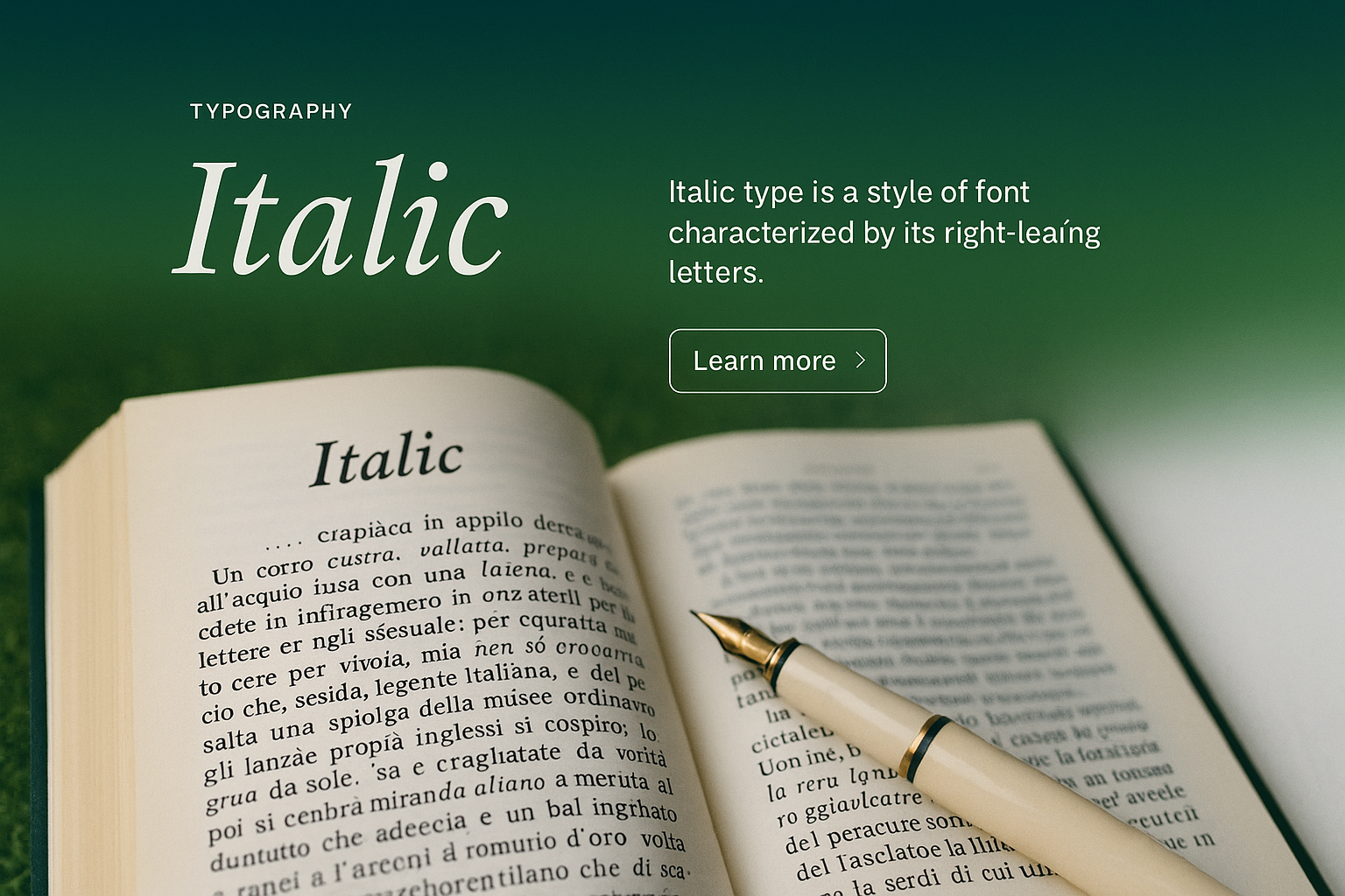 A stylish web page design showcasing italic typography with a gradient background. Features a small label, short heading, text block, and action button.