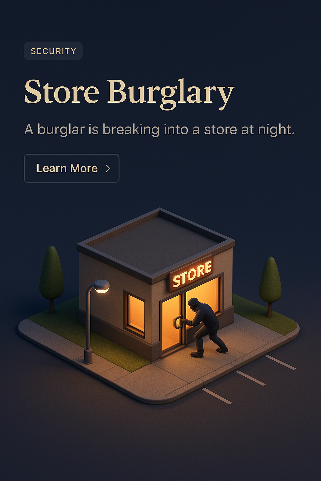 A 3D illustration depicting a burglar attempting to break into a store at night, with a dark gradient background and well-lit storefront.