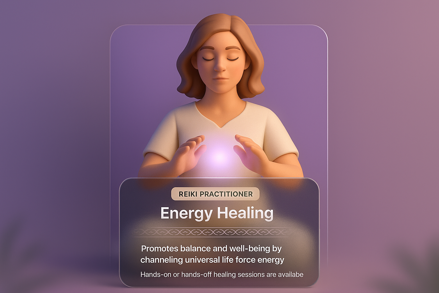 /Collection: /by davooda/Type: PNG/A visually appealing 3D illustration of a Reiki practitioner, showcasing energy healing. The design features a translucent panel with a title and description, integrating text seamlessly with the image.