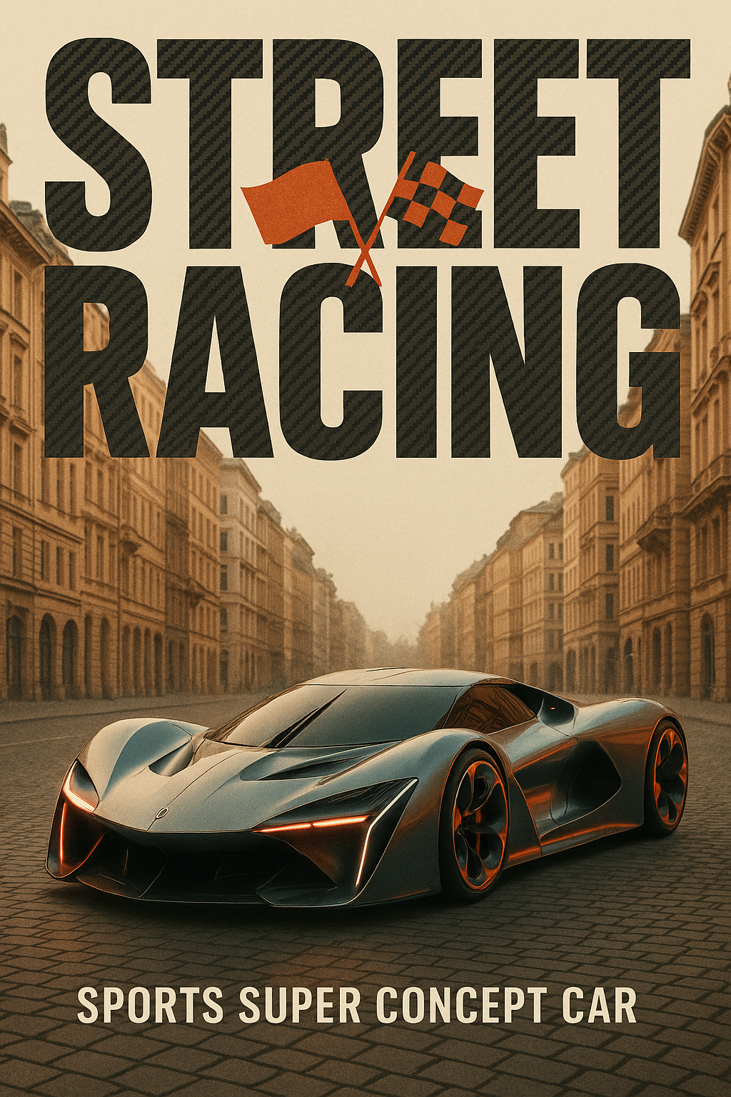 /Collection: , /by davooda/Type: PNG/A striking promotional graphic featuring a futuristic sports car set against a city backdrop, ideal for automotive marketing or racing events. The bold typography enhances the excitement of street racing.