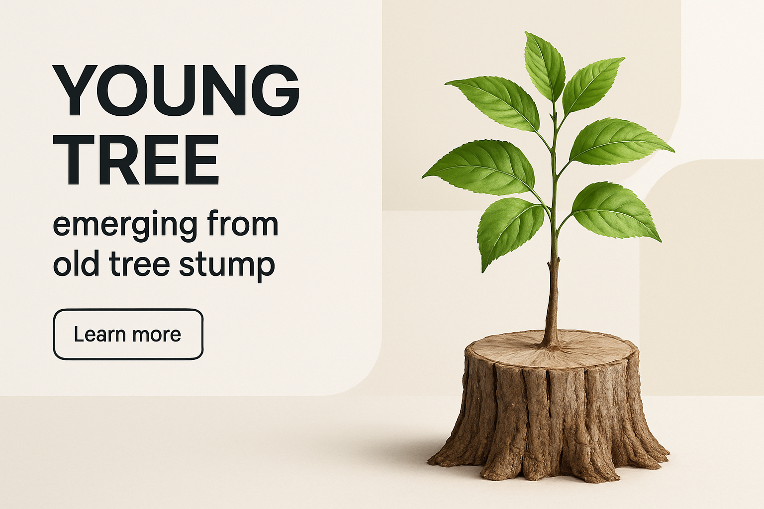 /Collection: /by davooda/Type: PNG/A young tree is emerging from an old tree stump, set against a clean, geometric background. The composition features a modern layout with bold typography and a call-to-action button.