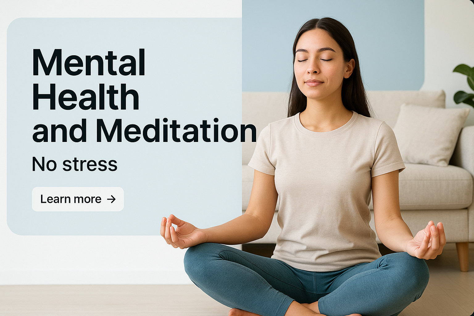 /Collection: /by davooda/Type: PNG/A serene young woman sits cross-legged on the floor, eyes closed, meditating in a well-lit living room. The modern background features geometric shapes, enhancing the peaceful atmosphere.
