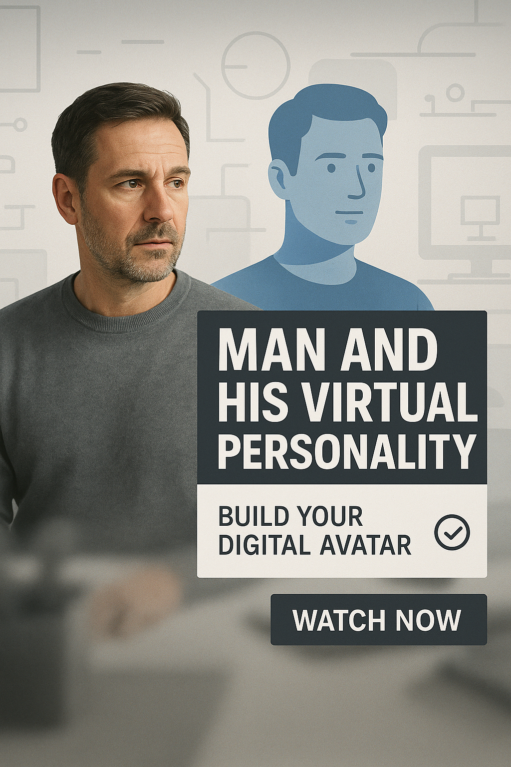 Engaging promotional banner illustrating a man's contemplation alongside a stylized avatar, designed for a campaign on digital identity creation. Ideal for digital marketing.