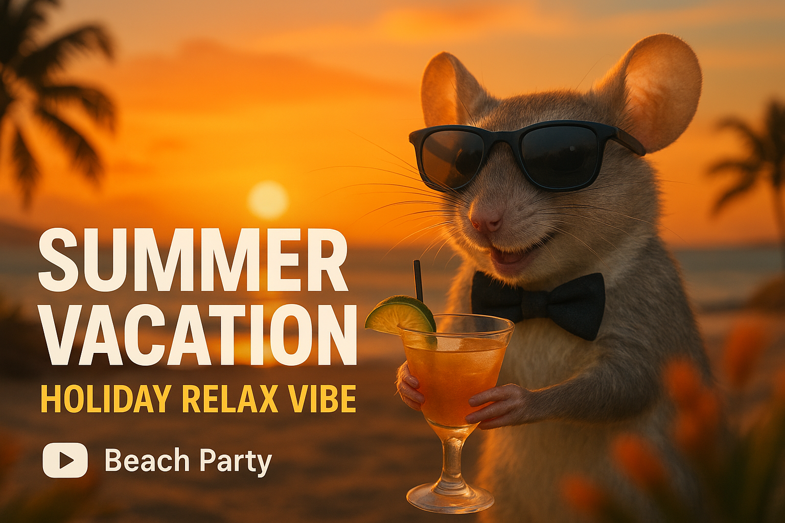 /Collection: /by davooda/Type: PNG/Whimsical illustration depicting a mouse in sunglasses enjoying a cocktail at sunset, perfect for summer-themed promotions or social media posts.