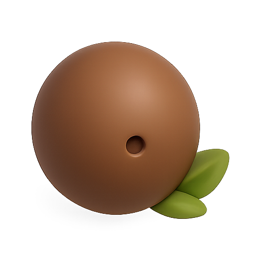 A minimalistic 3D representation of a brown sphere with a small hole, complemented by two green leaves. Ideal for branding or product mockup in eco-friendly contexts.
