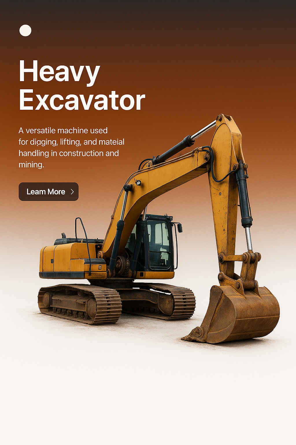A heavy excavator displayed on a gradient background, showcasing its features. The design includes a concise title and description with a call-to-action button.