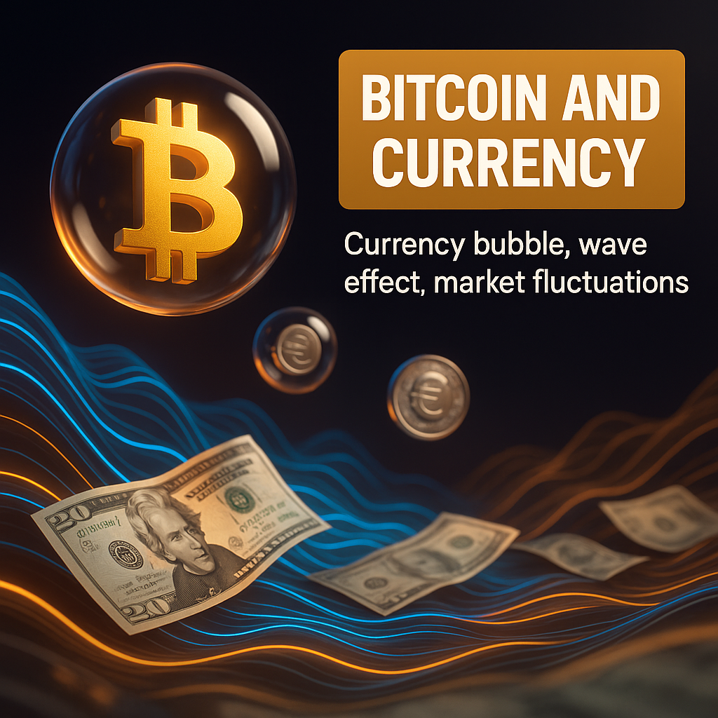 /Collection: /by davooda/Type: PNG/A digital graphic illustrating the concept of Bitcoin and currency fluctuations, featuring a 3D Bitcoin symbol, currency notes, and dynamic wave effects, suitable for financial articles or presentations.