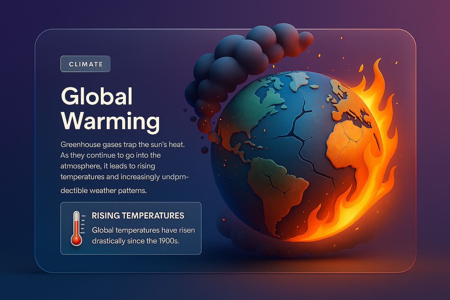 /Collection: /by davooda/Type: PNG/A striking 3D illustration depicting Earth experiencing global warming, featuring flames and smoke. The design includes informative text about rising temperatures and climate change.