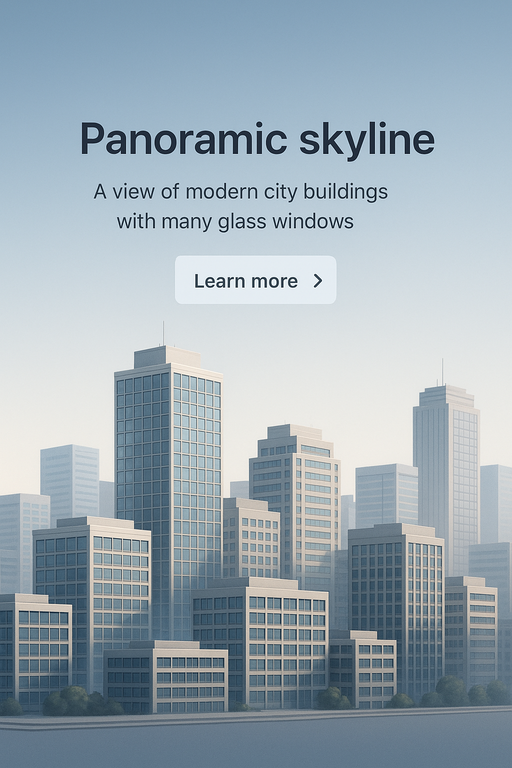 A detailed 3D illustration of a panoramic skyline featuring modern city buildings adorned with numerous glass windows, set against a smooth gradient background.