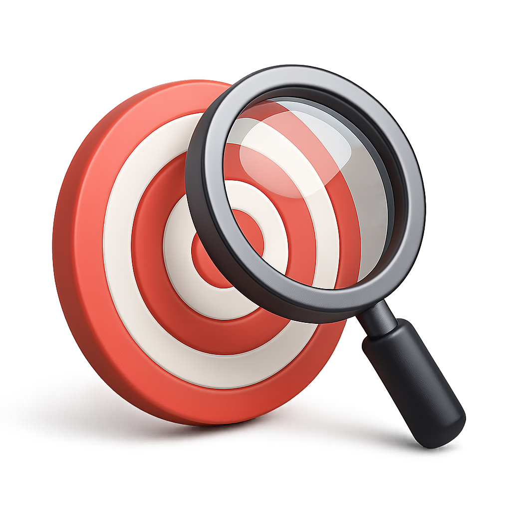 This image features a 3D magnifying glass positioned over a red and white target. The design showcases an isometric perspective with a glossy finish, enhancing its volumetric feel.