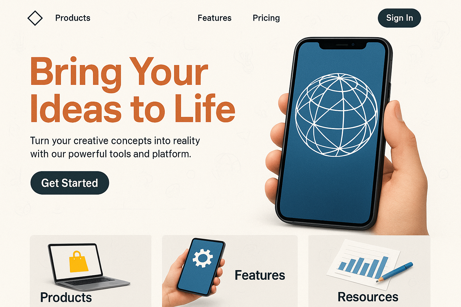 /Collection: /by davooda/Type: PNG/A modern landing page layout featuring a smartphone displaying a globe logo. The design includes sections for products, features, and pricing, with bold typography and a clean, dynamic composition.