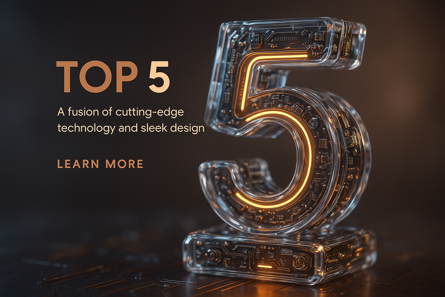 /Collection: /by davooda/Type: PNG/A stunning 3D scene showcasing the number 5, crafted from clear polymers with intricate inner technology illuminated by neon lights. The design features metallic reflections and a soft, foggy ambiance.