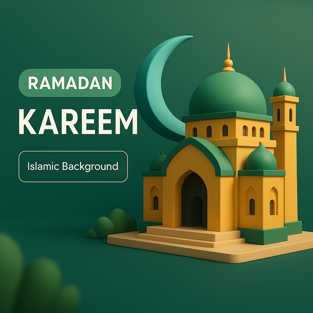 /Collection: /by davooda/Type: PNG/A modern 3D illustration featuring a mosque and crescent moon in flat geometric style. The design emphasizes a harmonious color palette and layered composition for a festive Ramadan theme.