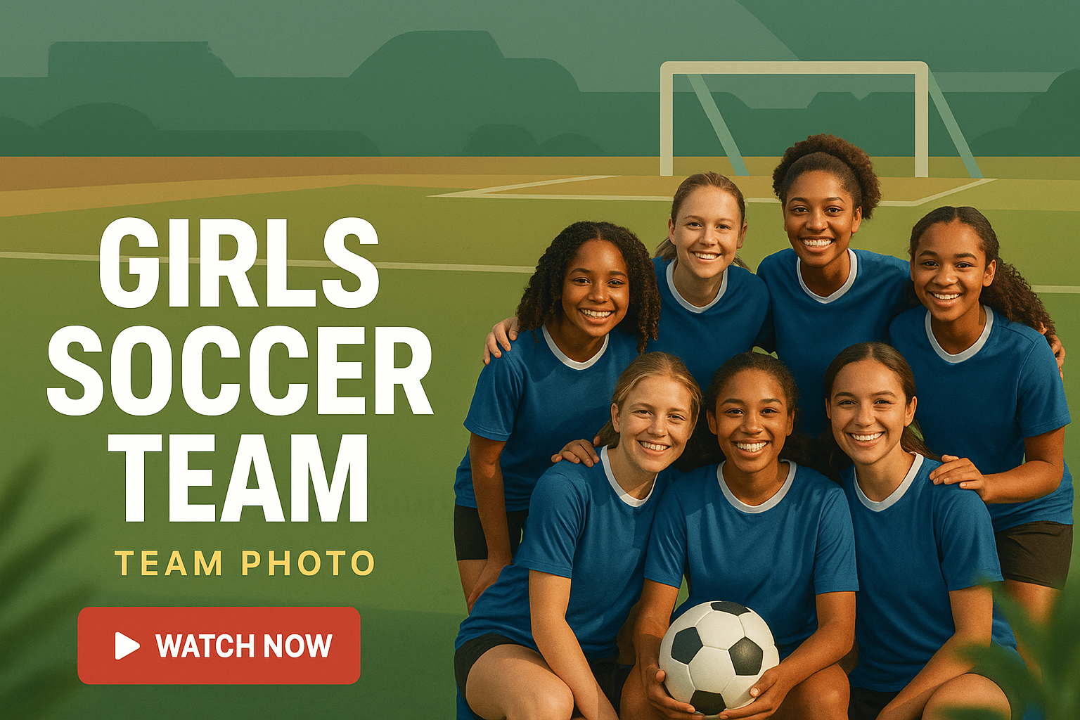 Vibrant team photo featuring a group of young female soccer players in blue uniforms, set against a soccer field backdrop. Ideal for promoting youth sports programs.