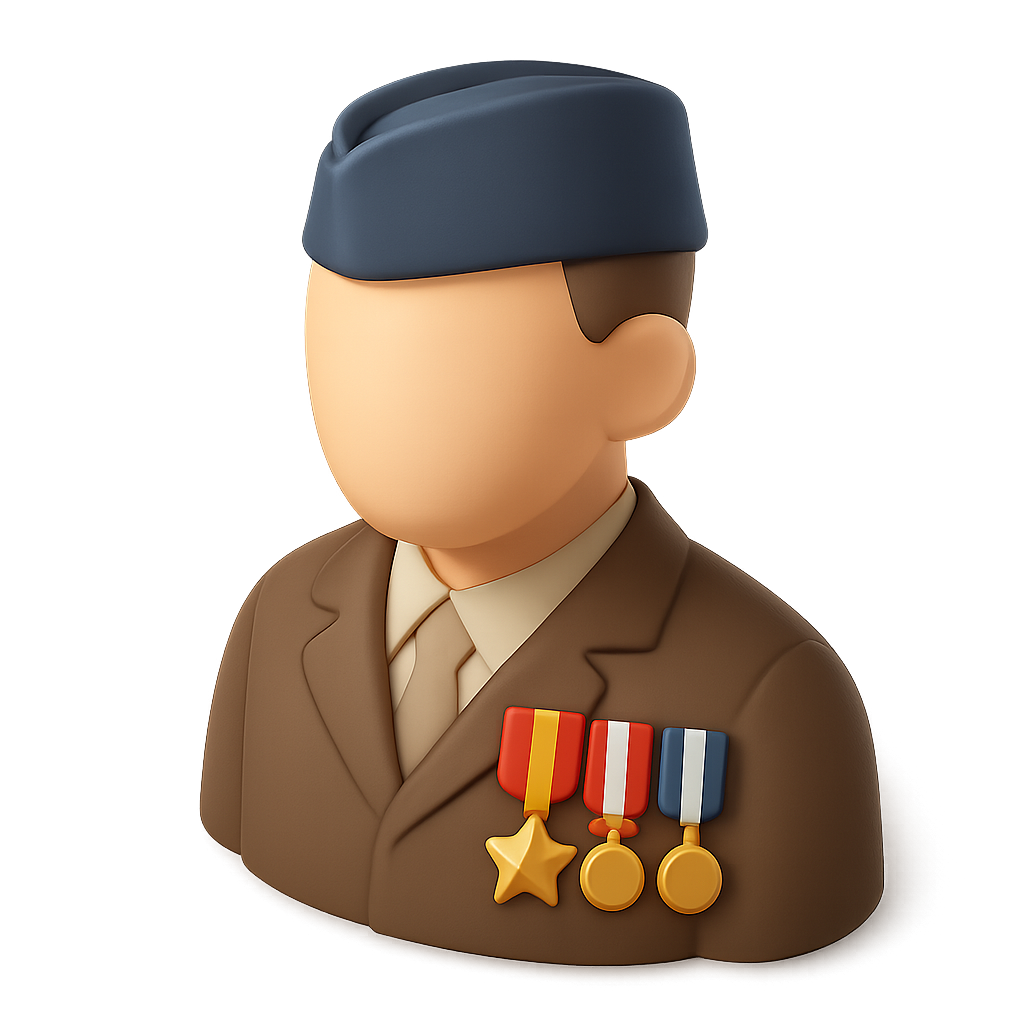 /Collection: /by davooda/Type: PNG/A simplistic 3D representation of a veteran figure, wearing a military uniform and hat, adorned with various medals. The design features a three-quarter view and a transparent background, emphasizing the volumetric and isometric style.