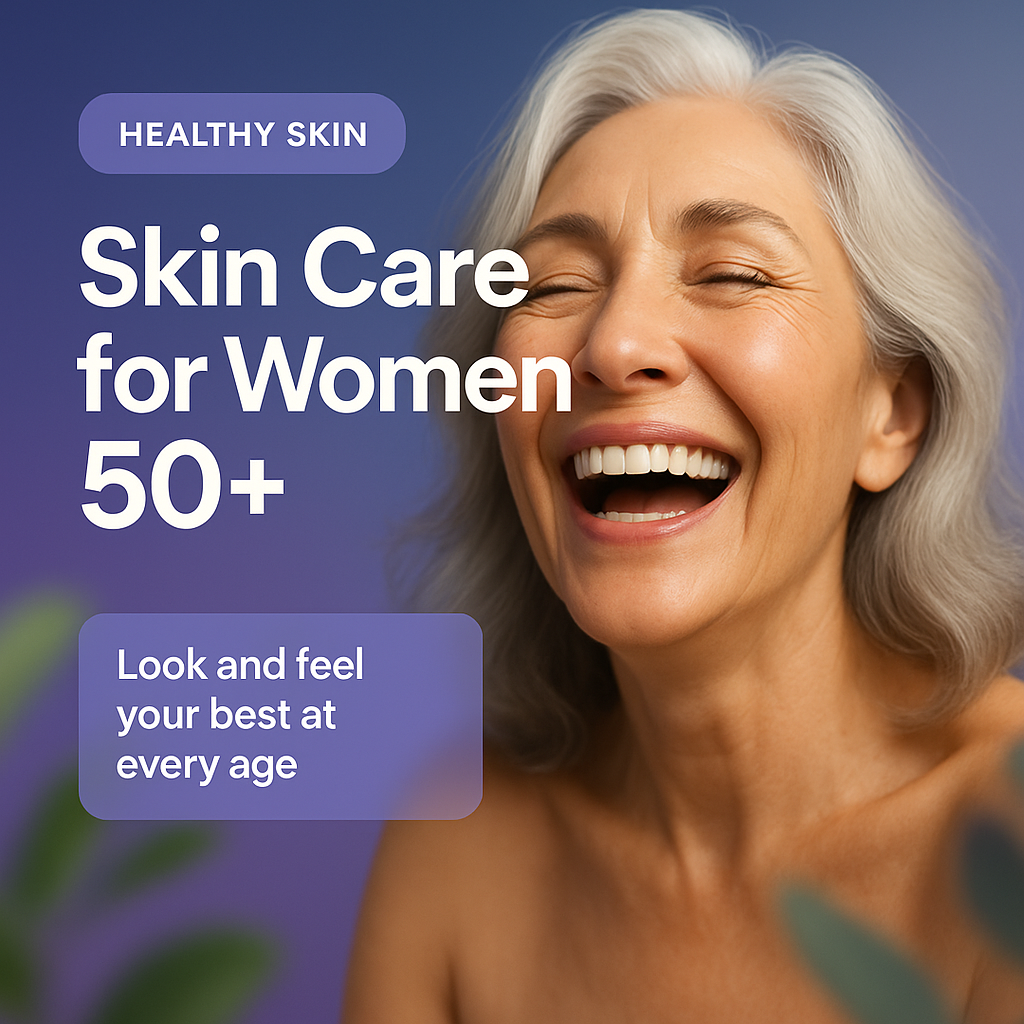 This is a vibrant social media post promoting skin care products for women aged 50 and above, featuring a joyful woman with healthy skin. The design is modern and uplifting.