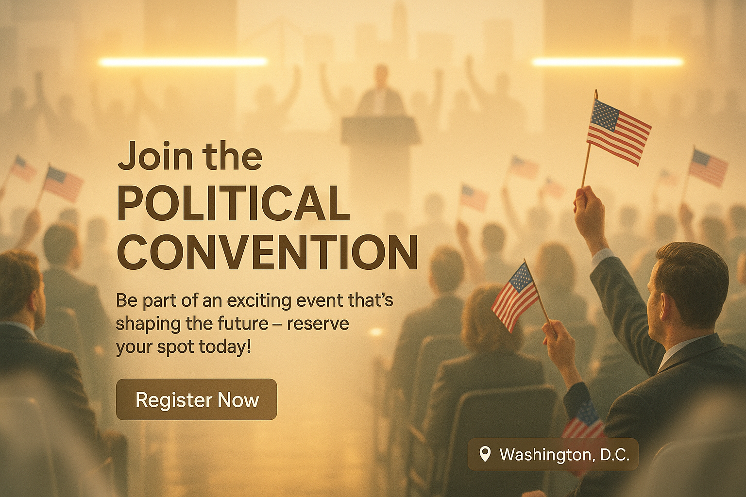 Inviting promotional banner for a political convention featuring an engaging visual of an audience with flags, ideal for event registration and awareness.