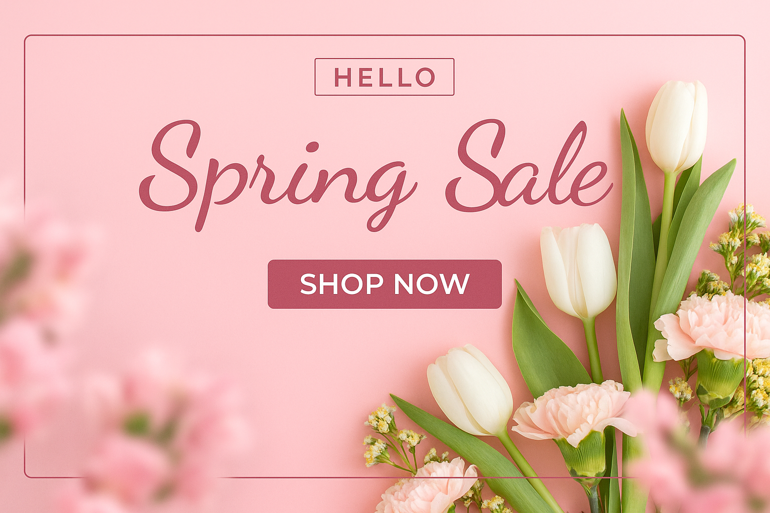 A beautifully designed greeting card featuring a light pink background adorned with tulips and other flowers. Perfect for spring sales promotions, with ample copy space.