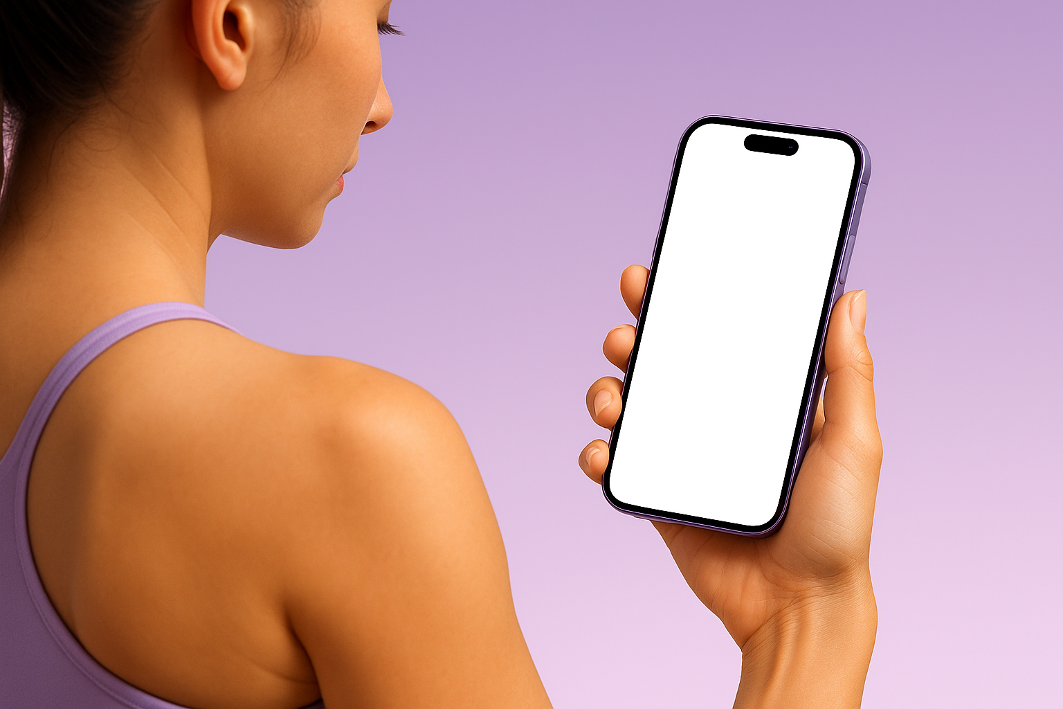 /Collection: /by davooda/Type: PNG/A dynamic shot of a sporty woman from behind, holding a smartphone with a blank white screen. The phone has rounded edges and is slightly narrow, set against a soft purple background.