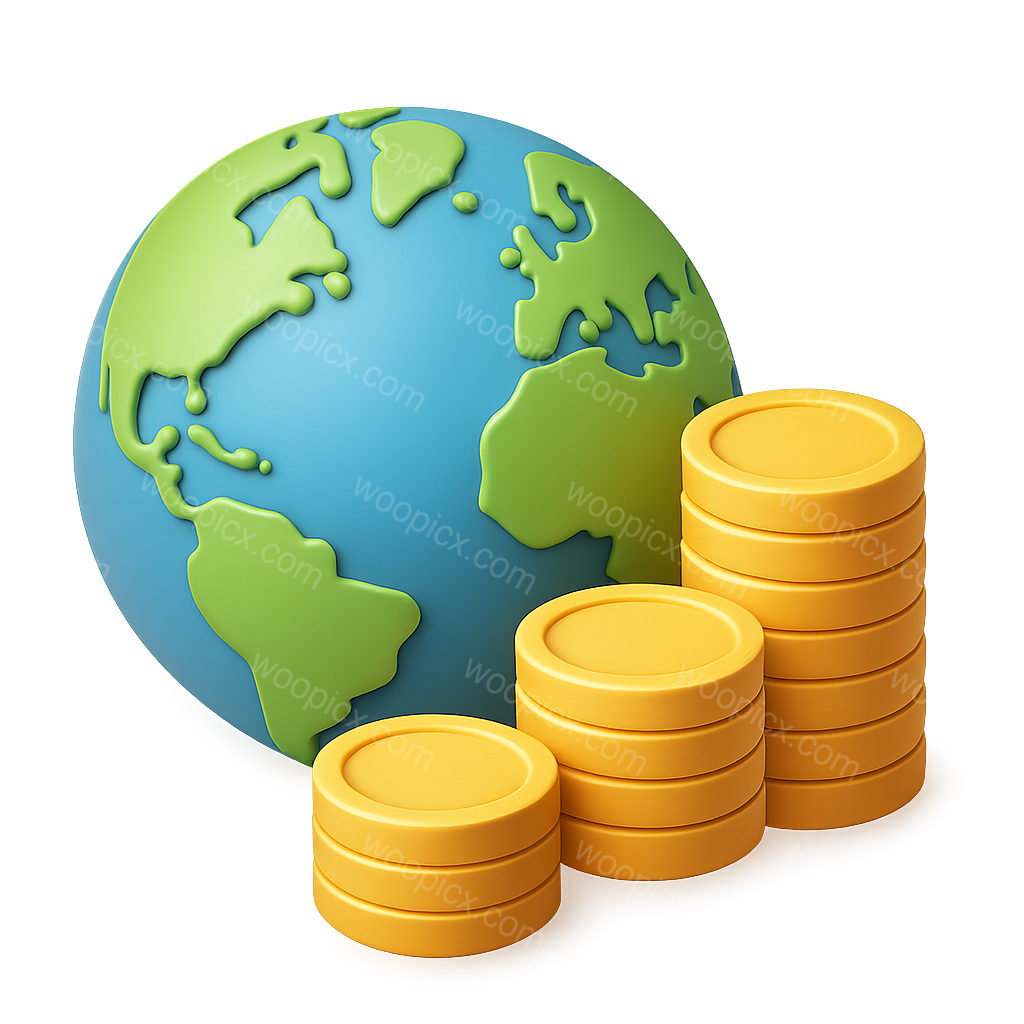 A stylized 3D globe featuring a green landmass on a blue ocean, accompanied by three stacks of golden coins. The image has an isometric perspective with a smooth, volumetric design.