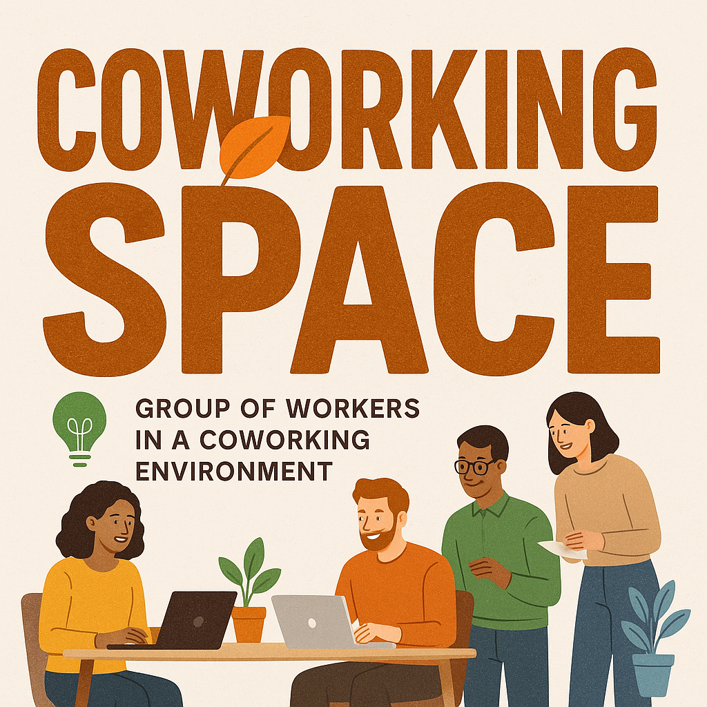 Vibrant illustration depicting a group of diverse professionals engaged in a coworking environment, ideal for promoting collaborative workspaces.