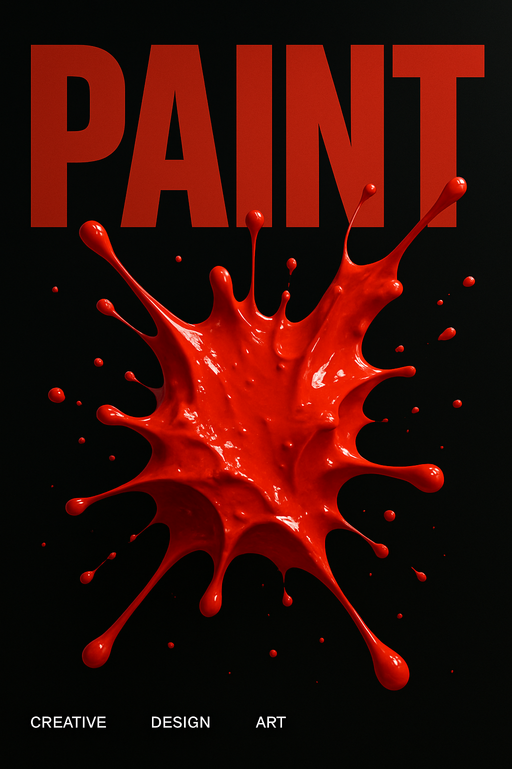 A vivid red paint splash against a black background, featuring bold typography. The splash is realistically rendered, creating a dramatic visual impact.
