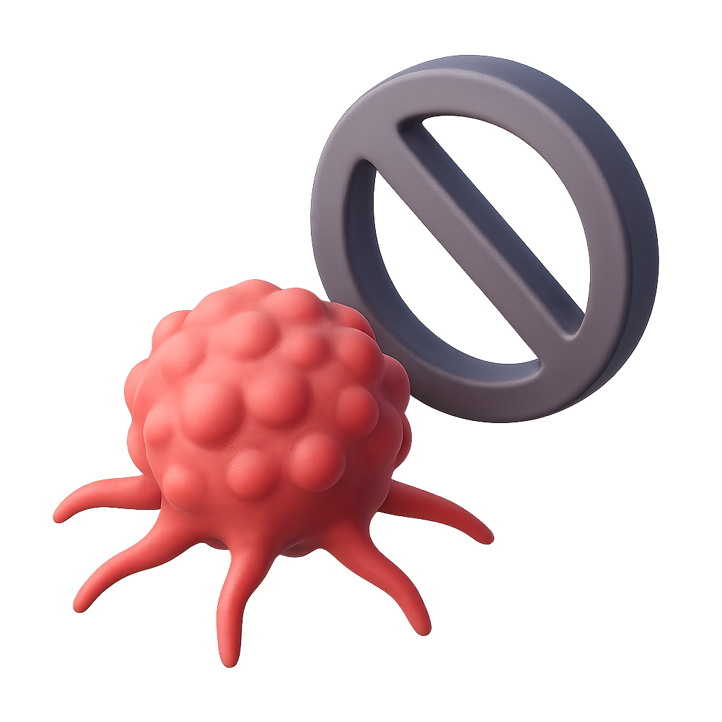 /Collection: /by davooda/Type: PNG/A visually striking 3D icon representing cancer, featuring a stylized cancer cell in red with a volumetric effect, alongside a gray no symbol, all on a transparent background.