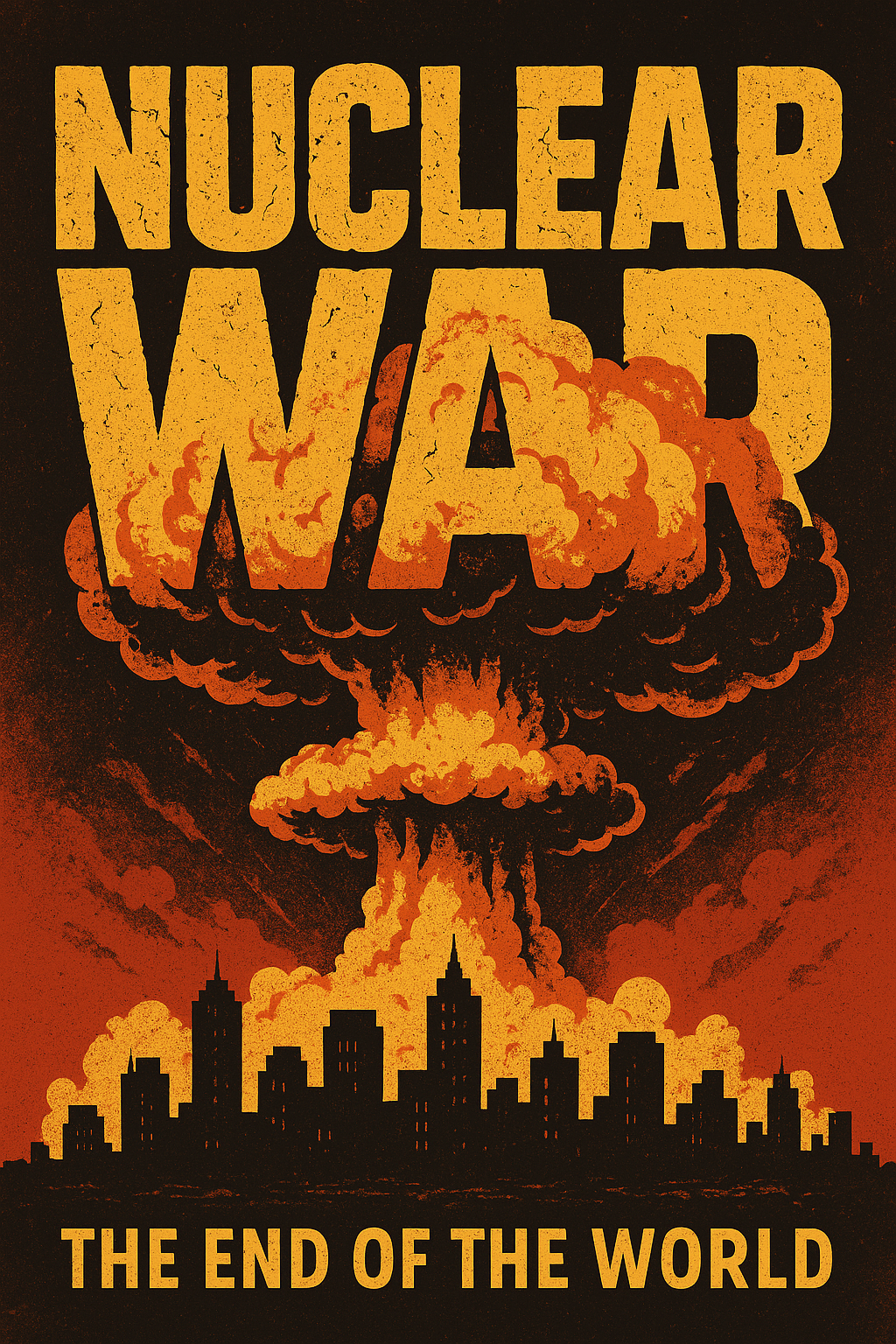 Bold graphic poster illustrating the theme of nuclear war with an apocalyptic cityscape. Designed for awareness campaigns or educational content on global issues.