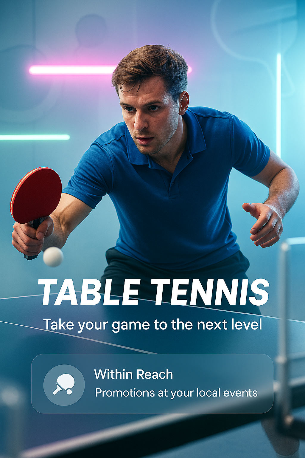 Vibrant promotional image featuring a table tennis player in action, designed to inspire and engage local sports enthusiasts. Ideal for event marketing.