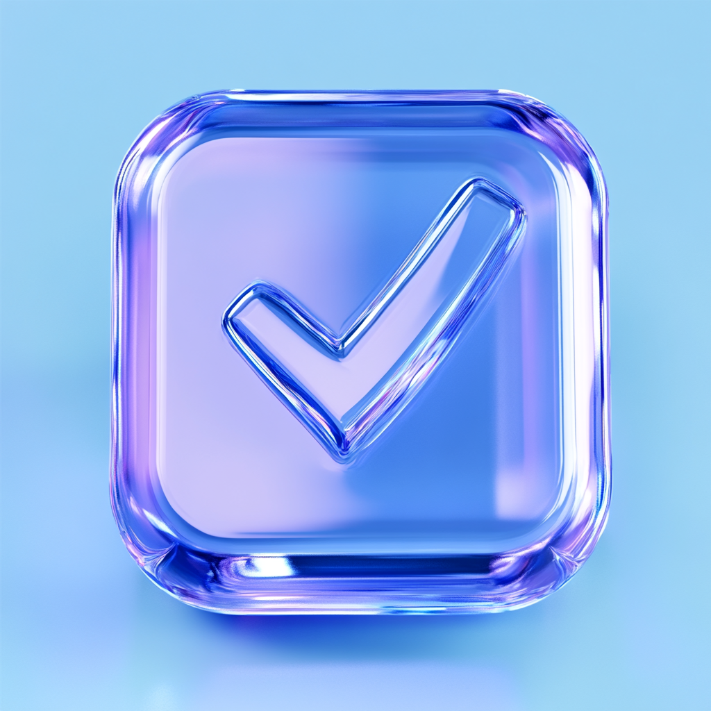 Stylish 3D checkmark icon designed with a glass-like effect, set against a soft blue background. Ideal for digital interfaces and user experience design.