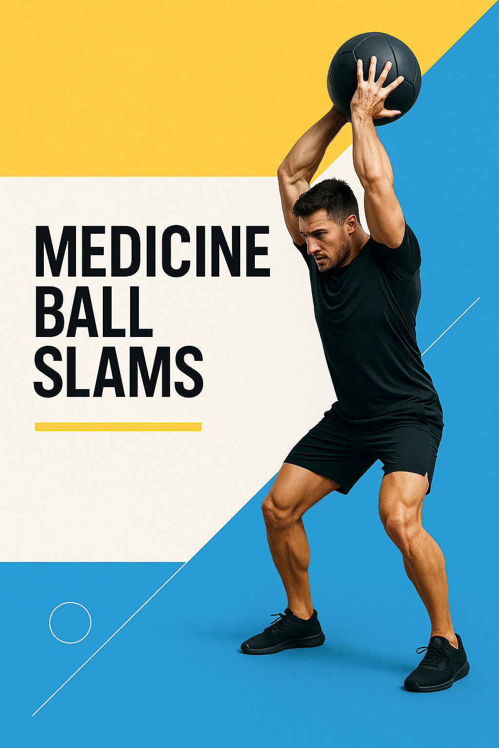 A dynamic and modern depiction of a person performing medicine ball slams, featuring a clean and structured layout with distinct color blocks.