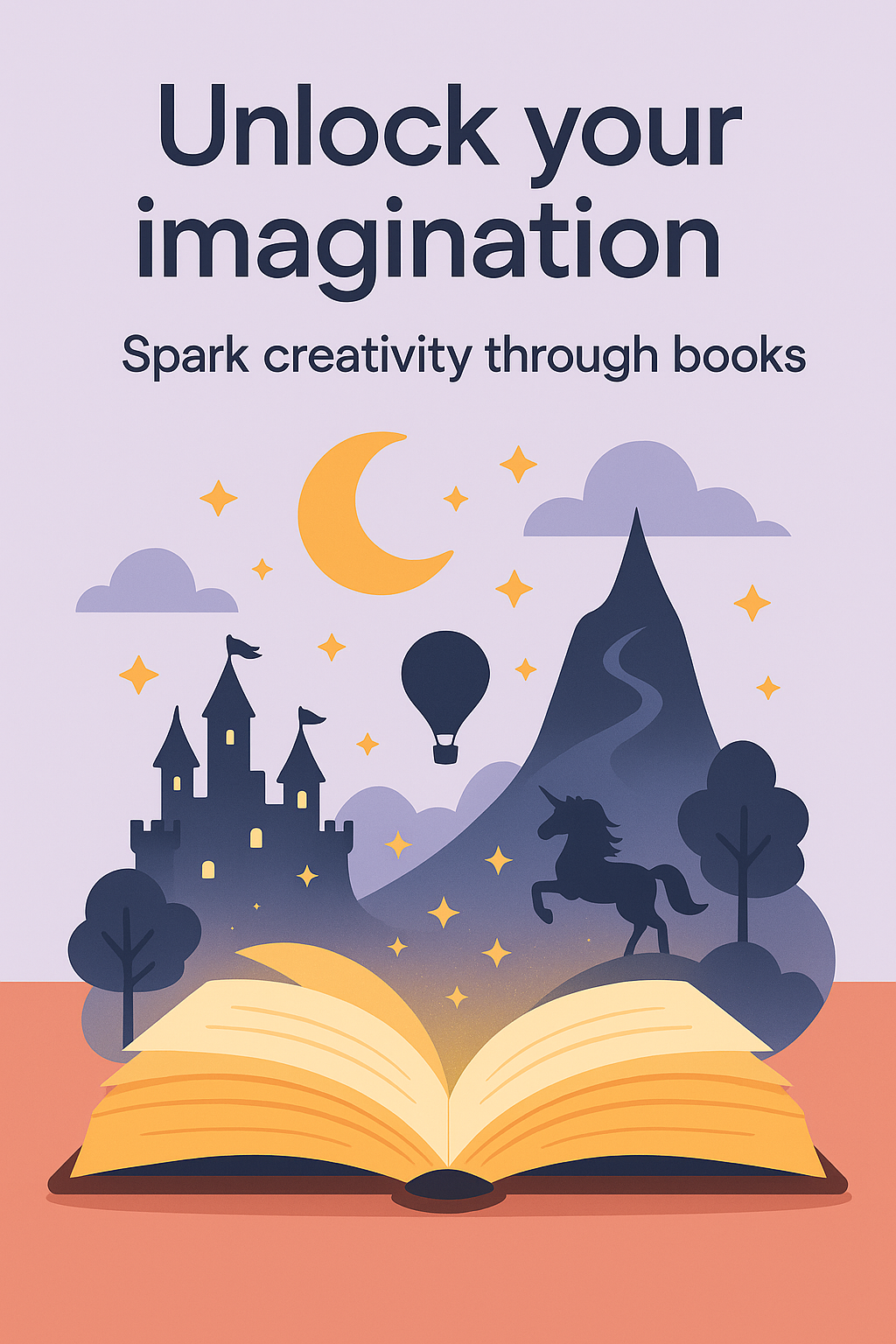 /Collection: /by davooda/Type: PNG/A whimsical illustration featuring an open book with enchanting elements like a castle, unicorn, and hot air balloon, ideal for promoting creativity and reading.