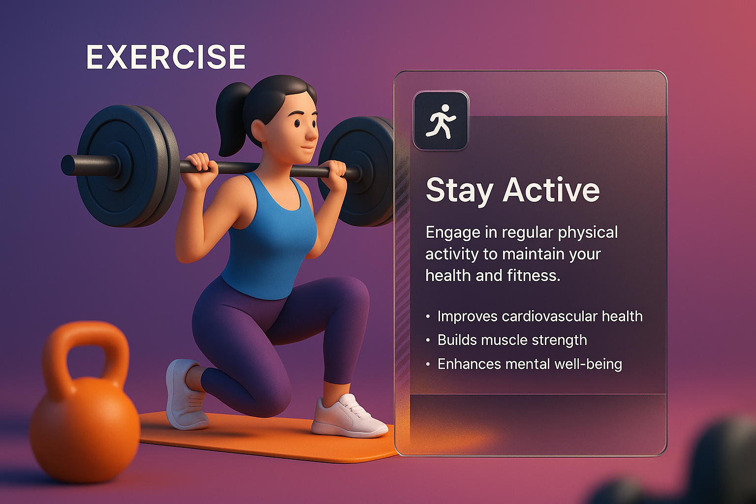 /Collection: /by davooda/Type: PNG/This 3D illustration showcases a woman performing a squat with weights, emphasizing physical activity. It features a gradient background and an informative panel highlighting health benefits.