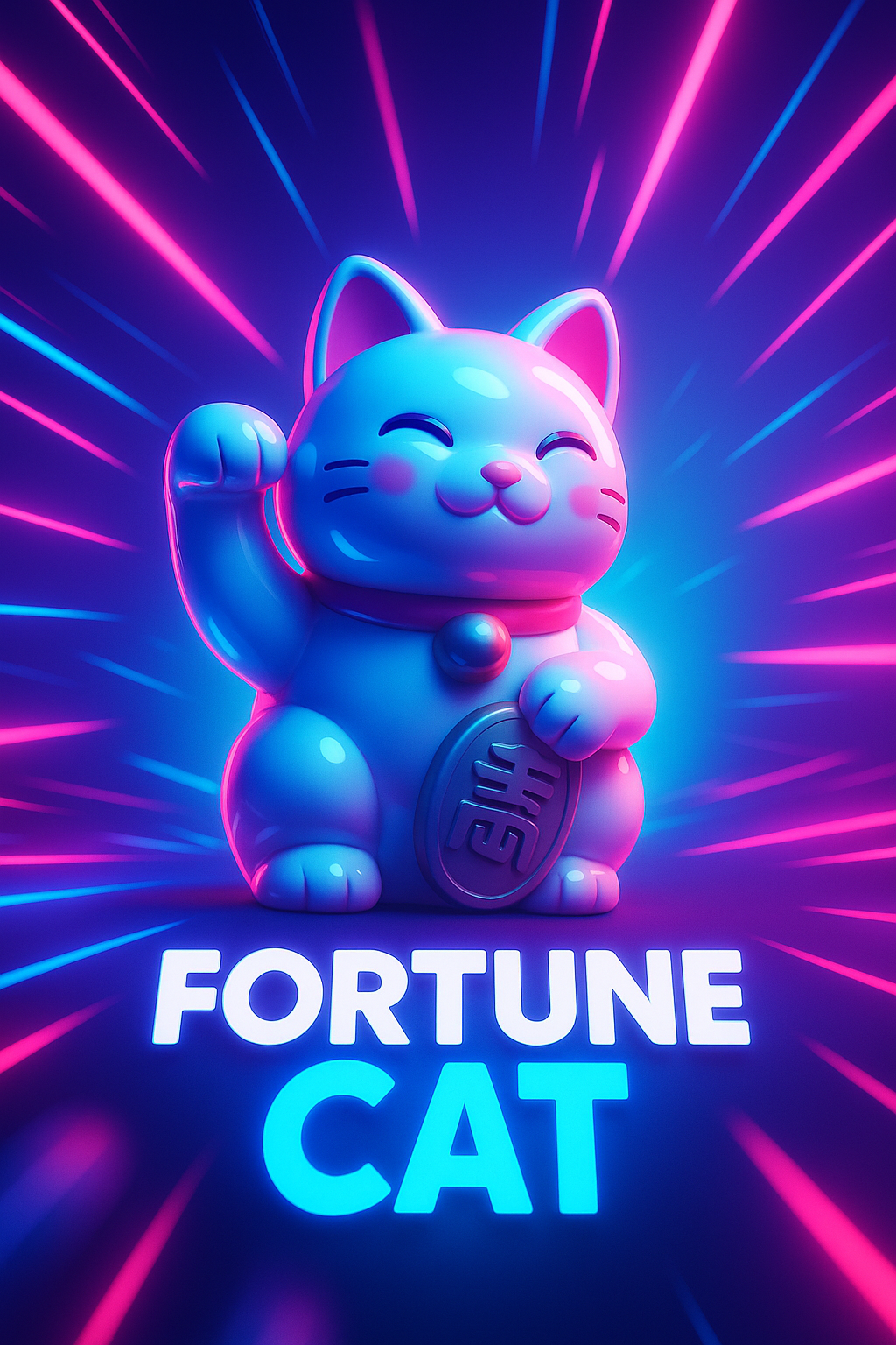 A vibrant 3D illustration of a fortune cat statue radiating dynamic energy. The neon glow creates a luminous halo effect, surrounded by colorful rays in the background, enhancing the lively atmosphere.