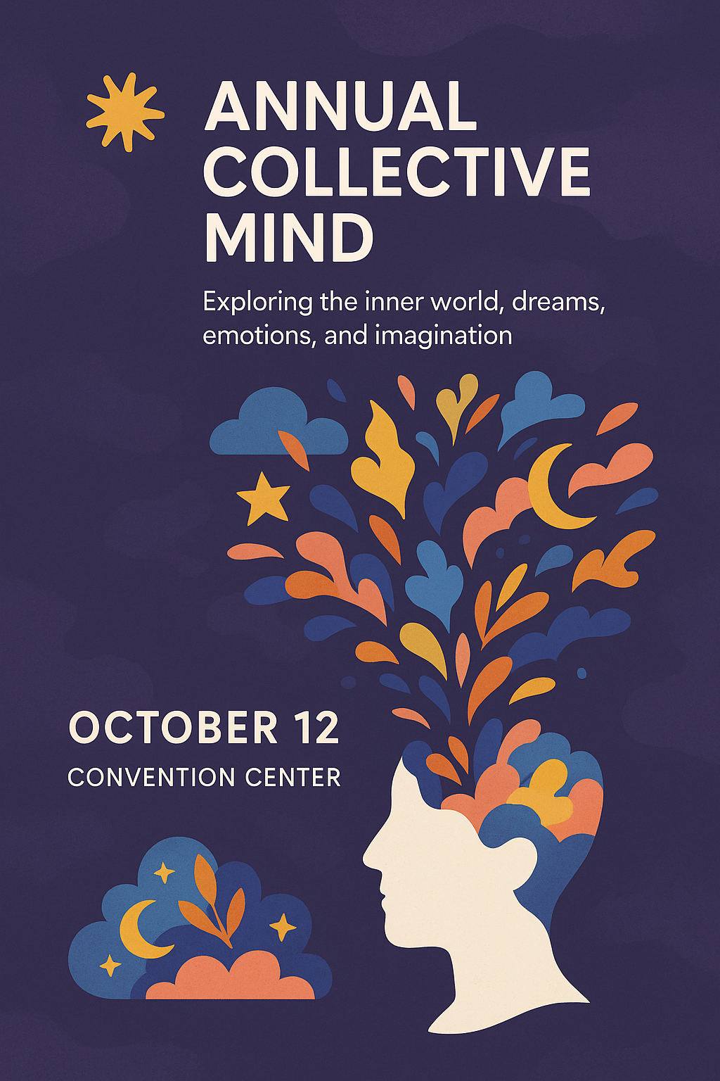Vibrant event poster showcasing a creative theme of exploring the inner world, featuring a silhouette with colorful elements representing thoughts and imagination. Ideal for promoting artistic gatherings.