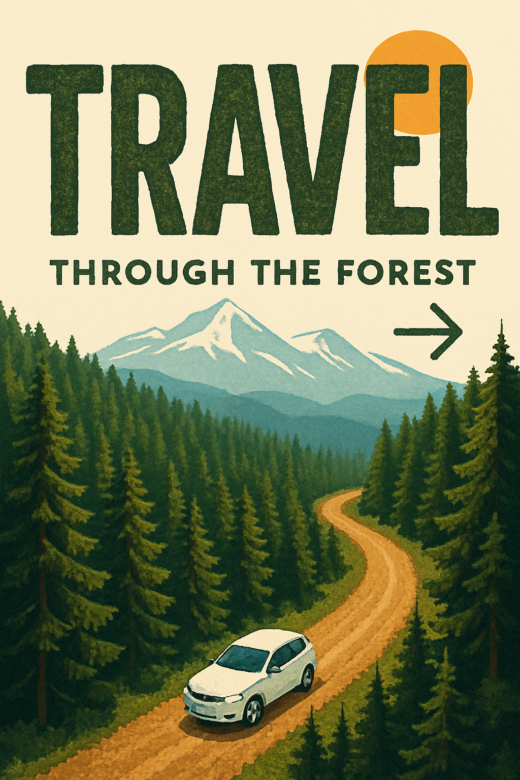 Illustrative Travel Poster Featuring Scenic Forest and Mountains