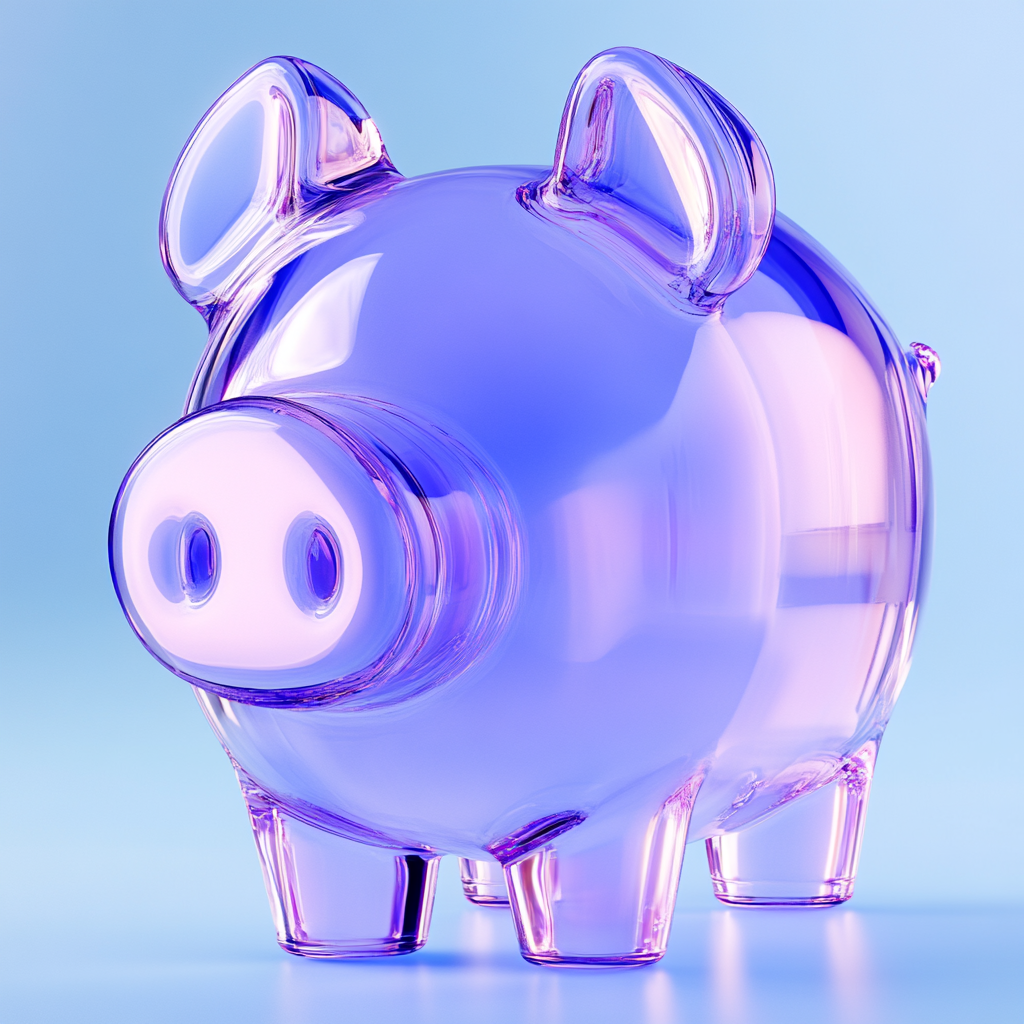 A modern and artistic depiction of a piggy bank made of glass, featuring a translucent purple hue. Ideal for financial themes, savings concepts, or creative design projects.