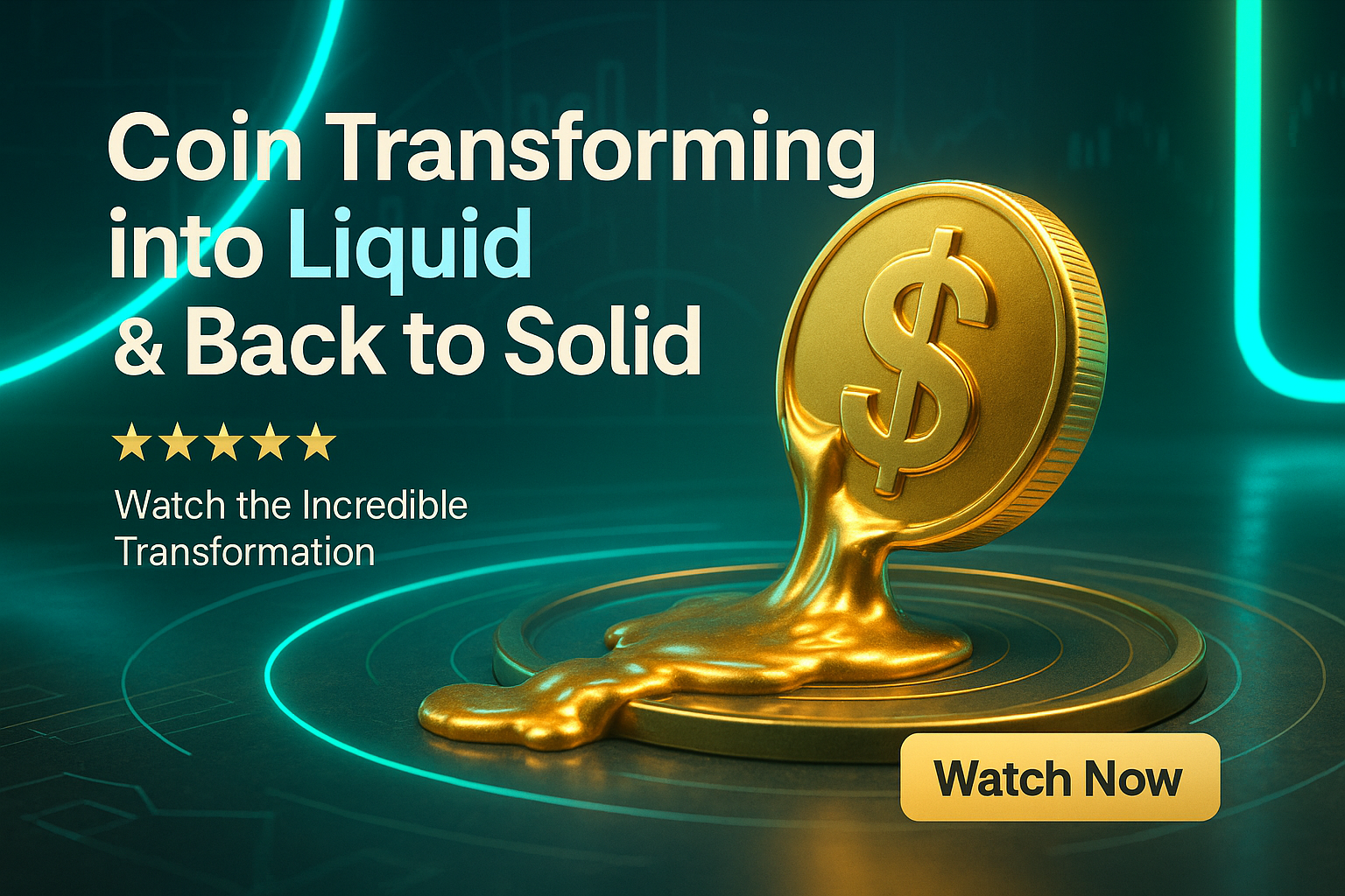 Visually striking 3D graphic depicting a golden coin melting into liquid and solidifying again, ideal for financial or cryptocurrency promotions.